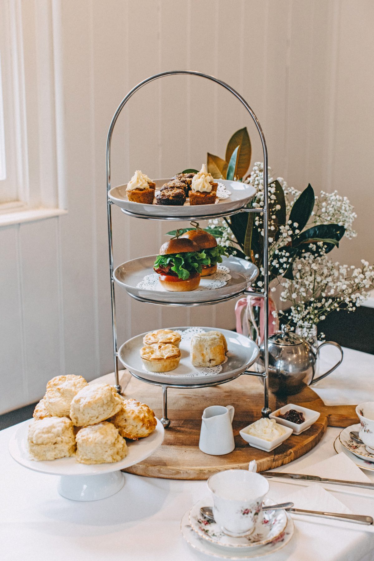 White chocolate and pistachio eclair, Mini Strawberry custard flan, in-house scones with raspberry jam and cream, turkey slider, mini pork sausage rolls, mini gourmet pie, three cheese mushroom quiches and a complimentary tea or coffee.